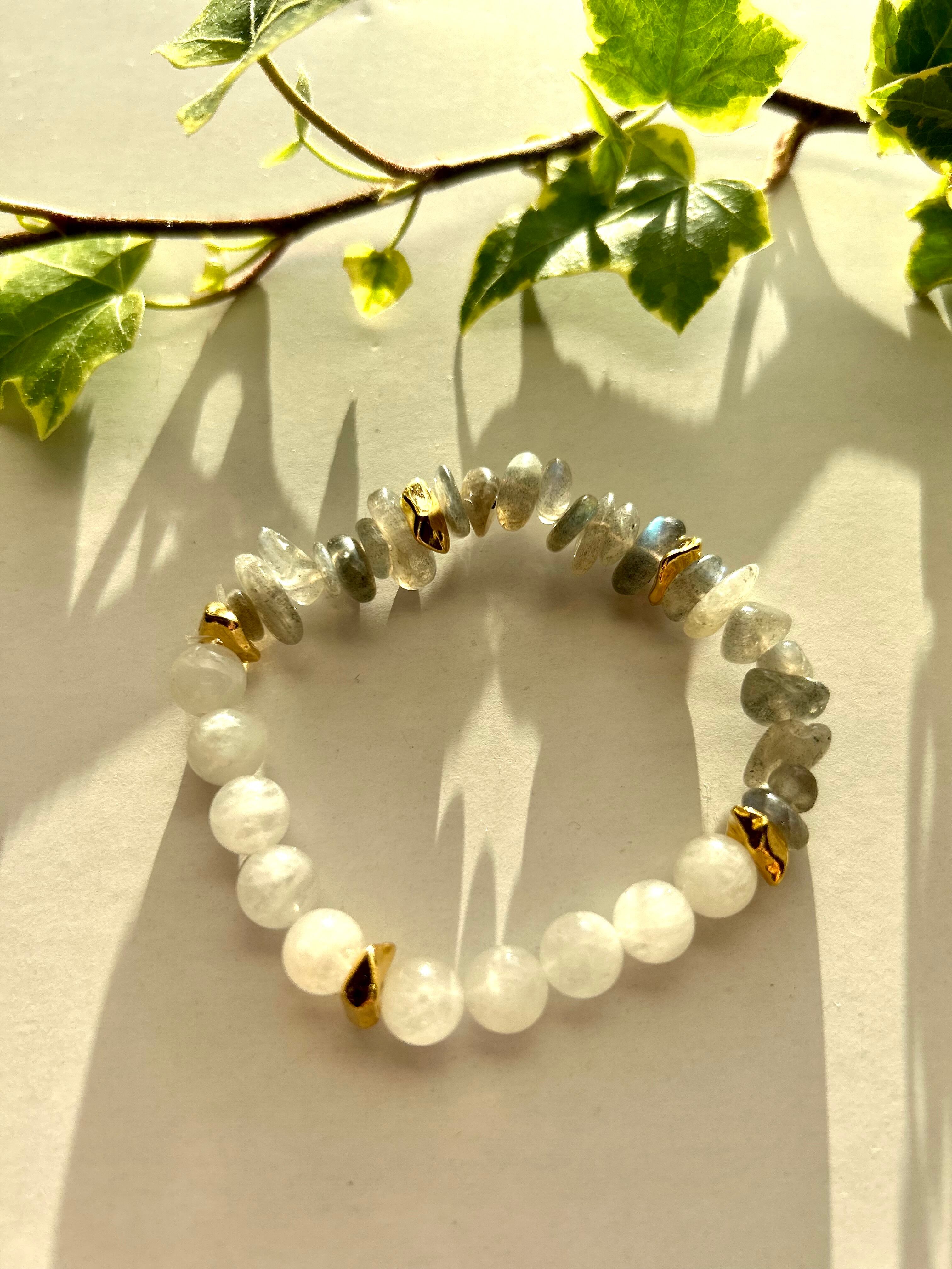 天然石ブレスレットです。半透明のホワイトラブラドライトと、輝きのあるラブラドライトを使用しています。天然石の味わい深い色と美しい輝きが、手元を華やかに演出してくれます。