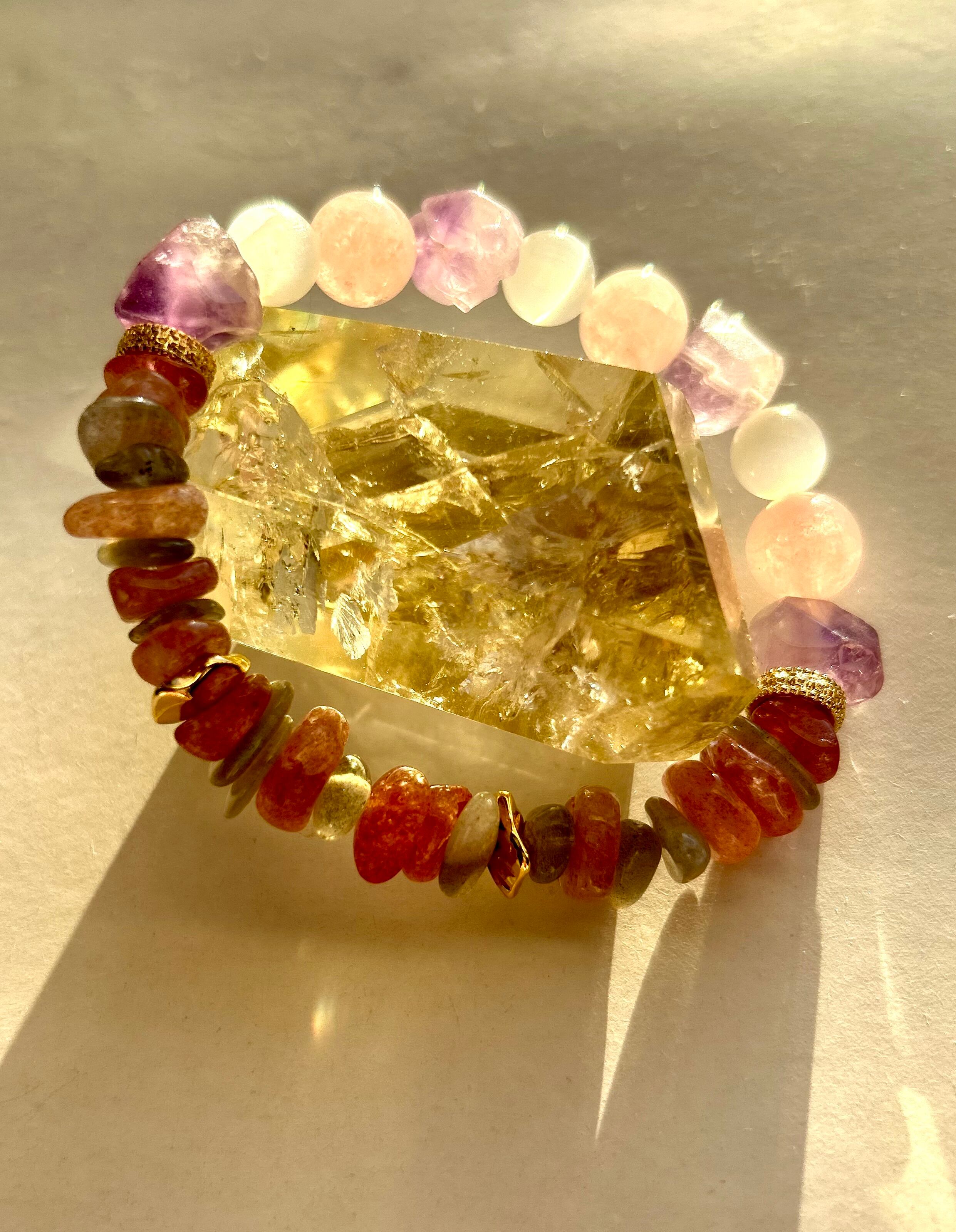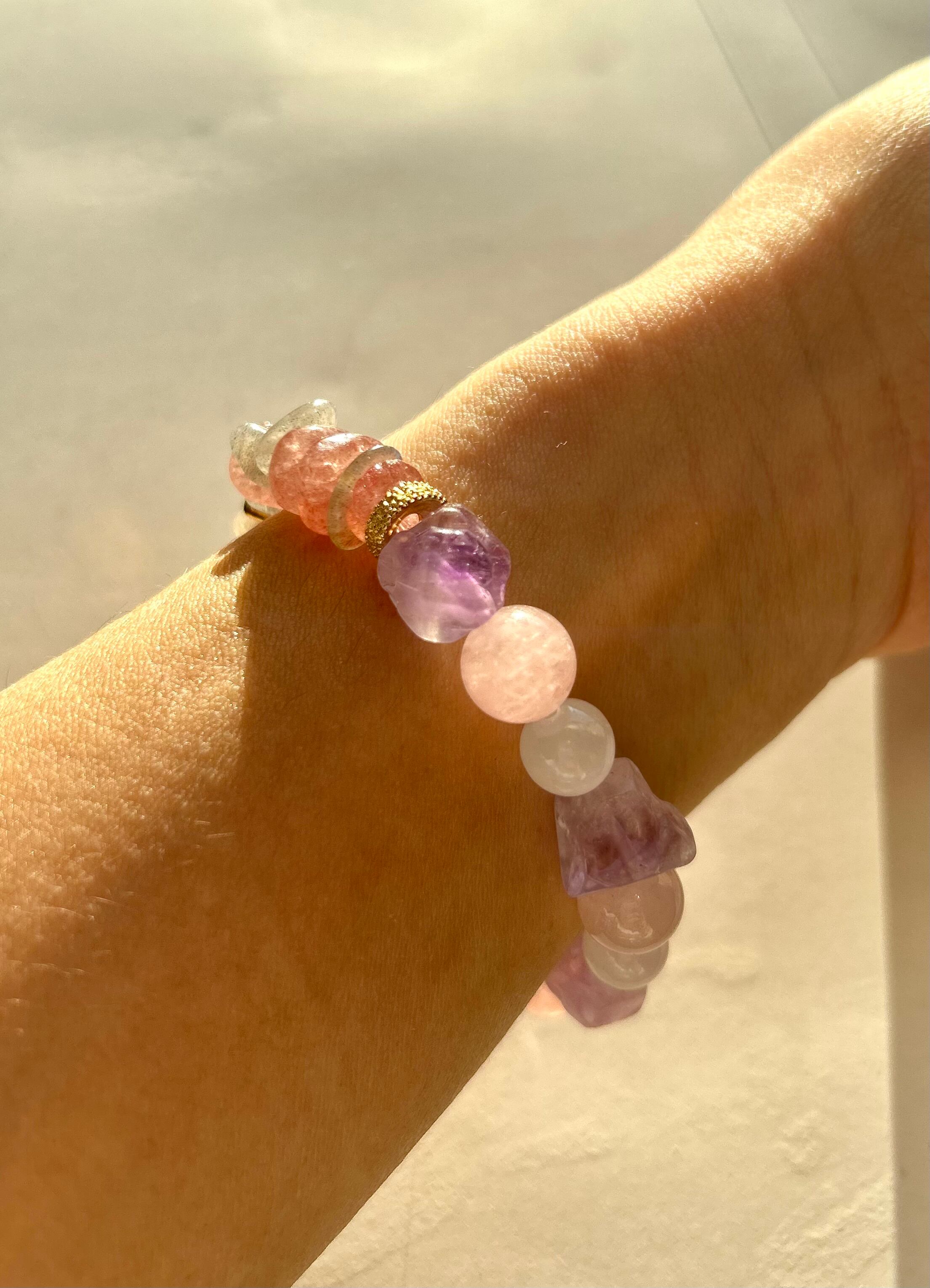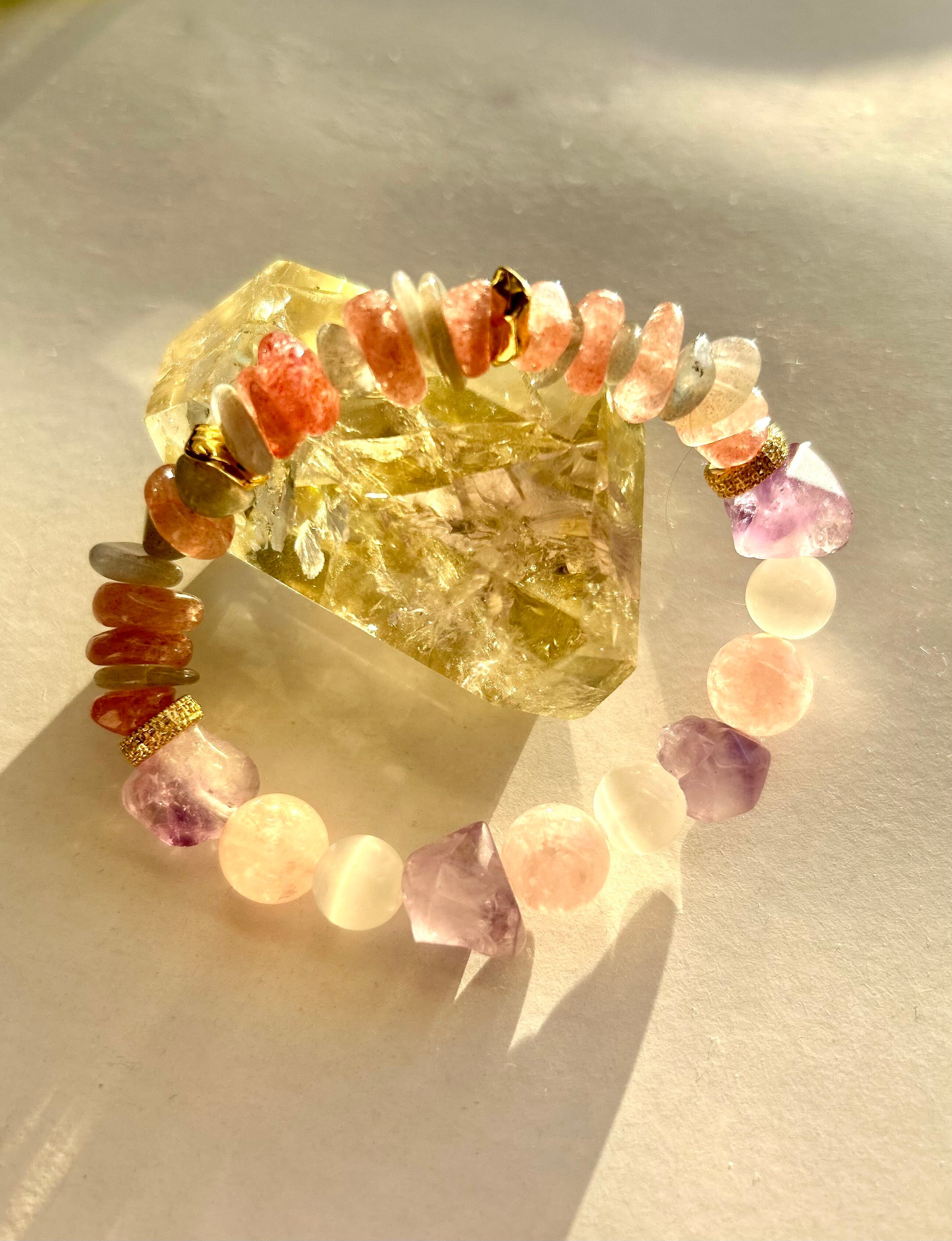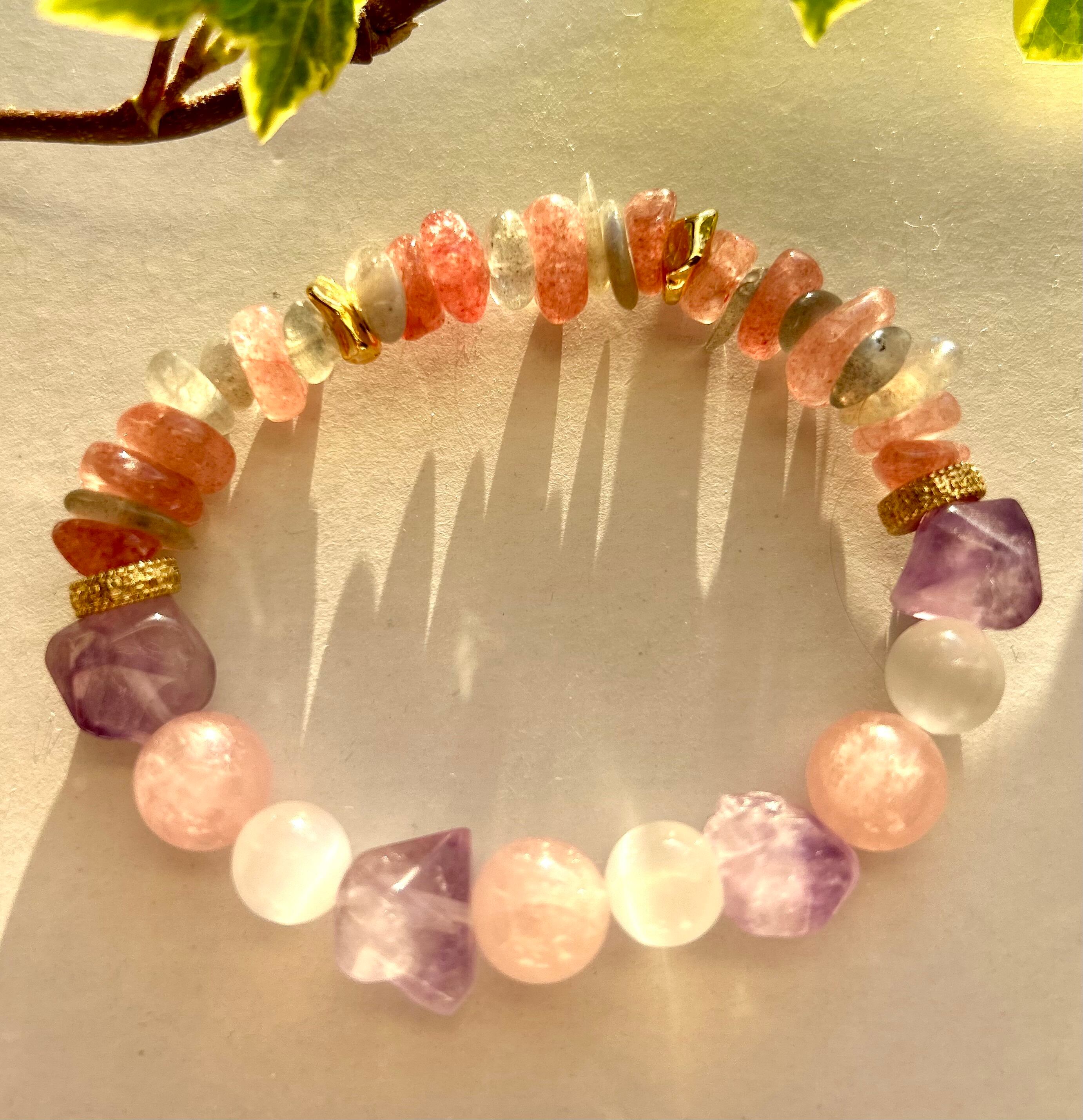 優しい色合いの天然石を使用したブレスレットです。ピンクモルガナイト、セリサイト、ラベンダーアメジスト、ストロベリークォーツ、ラブラドライトの美しい石が、手首を華やかに彩ります。