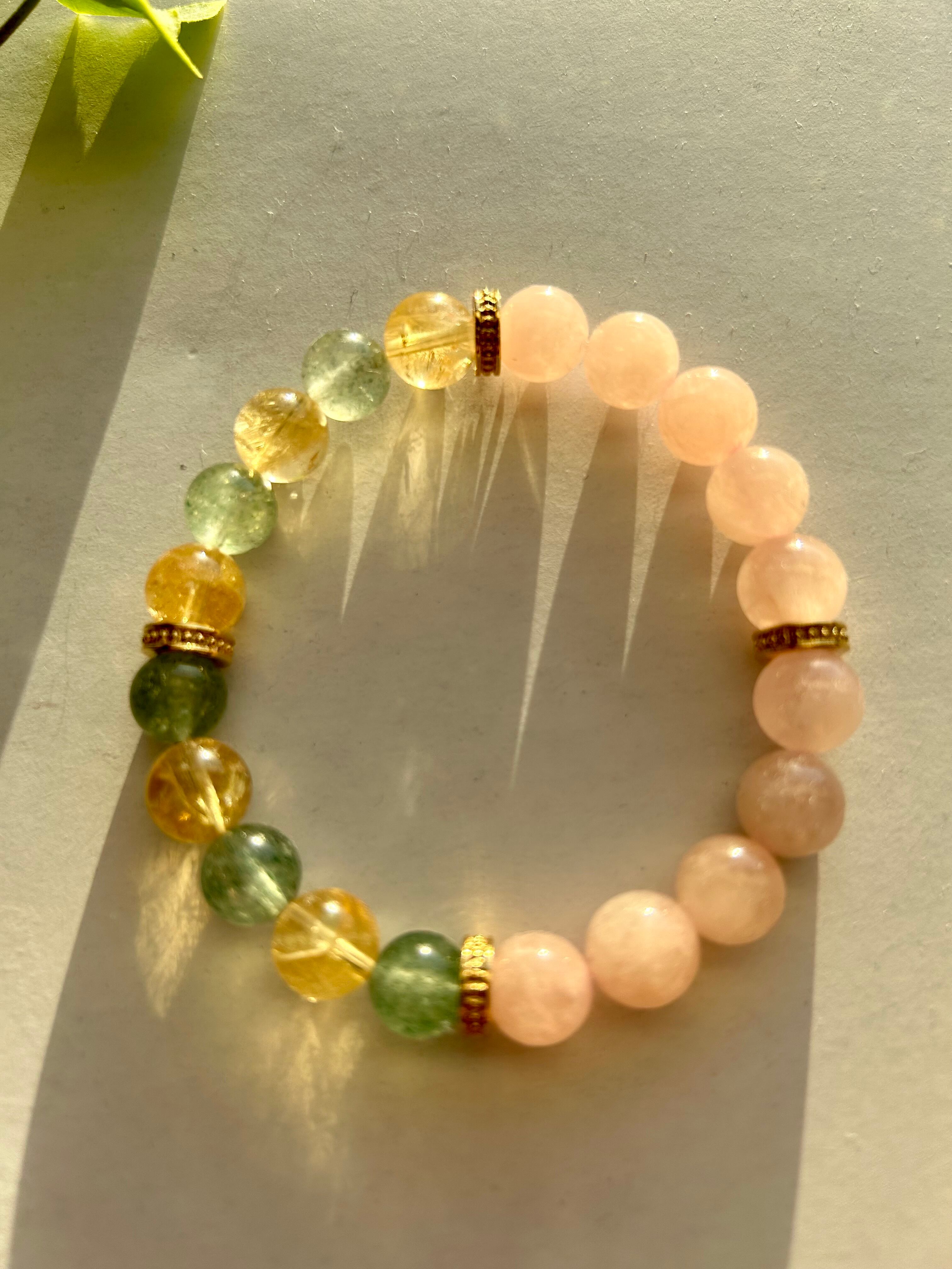 このブレスレットは、3種類の貴重な天然石がデザインされています。モルガナイトは愛と癒しのエネルギーを、フローツサイトインクォーツは希望とエネルギーを、シトリンは豊かさとパワーを象徴しています。明るい色合いは、心地よい気分を与えてくれるでしょう。