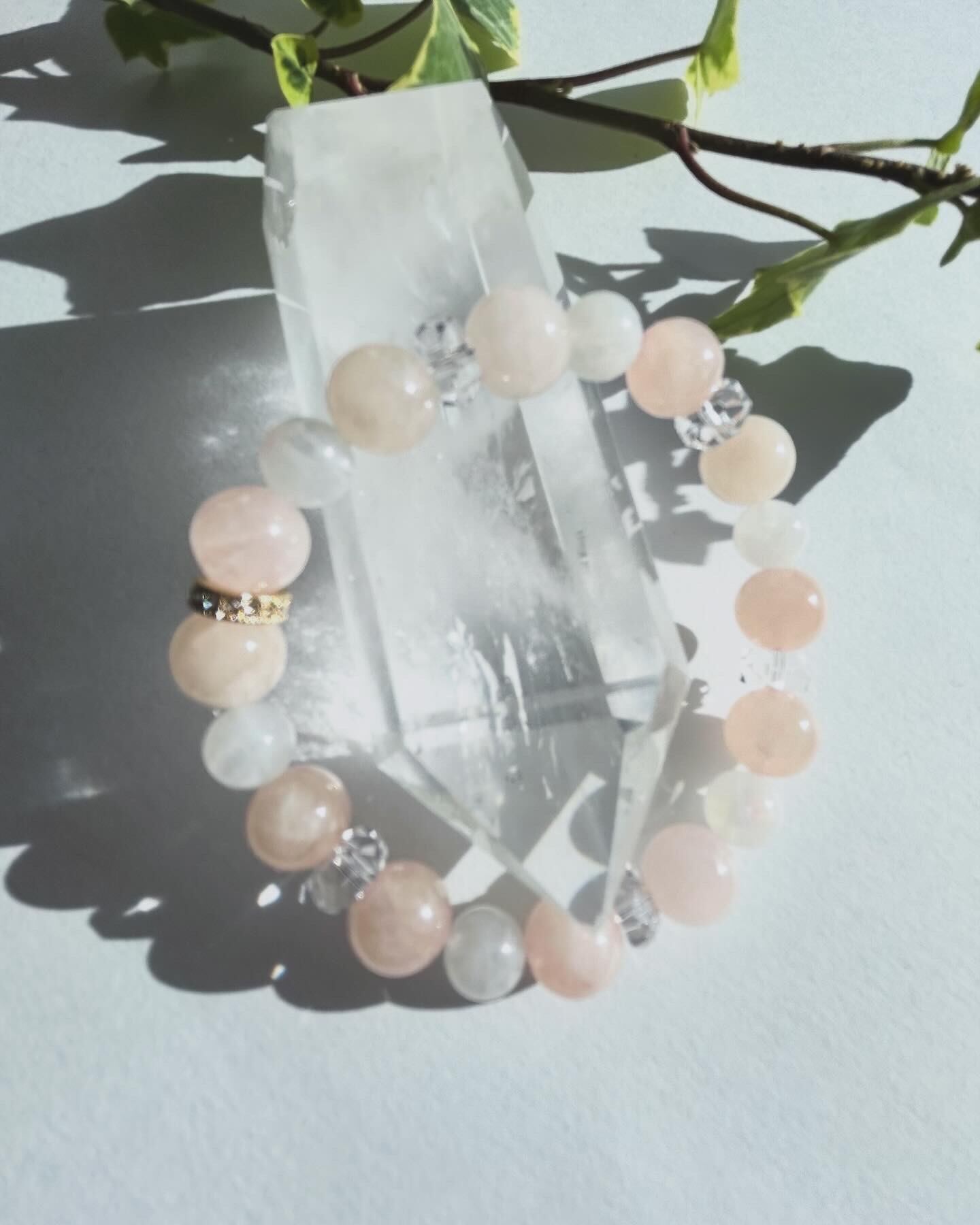 このブレスレットは腕に巻いて身に着けることで、モルガナイト、ホワイトラブラドライト、水晶の特性を活かし、心身のバランスを整えます。華やかさとともに心の平穏をもたらす一石三鳥のアイテムです。