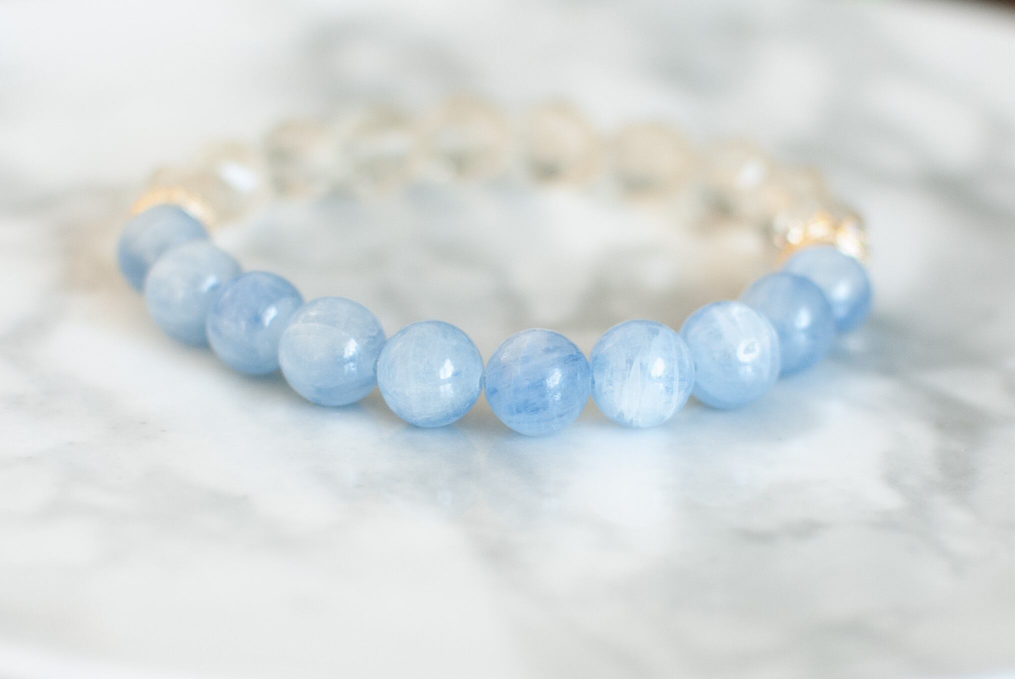 アイスブルーカイヤナイトとゴールデンラブラドライトのブレスレットです。