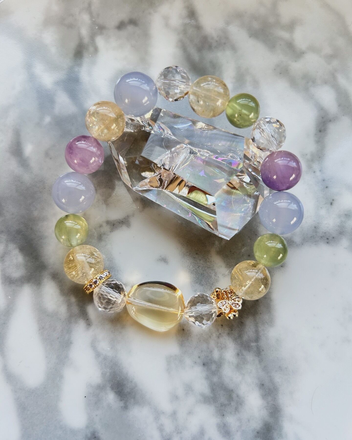 シトリン、水晶、プレナイト、エレスチャルアメジスト、ブルーカルセドニーを使用しています。