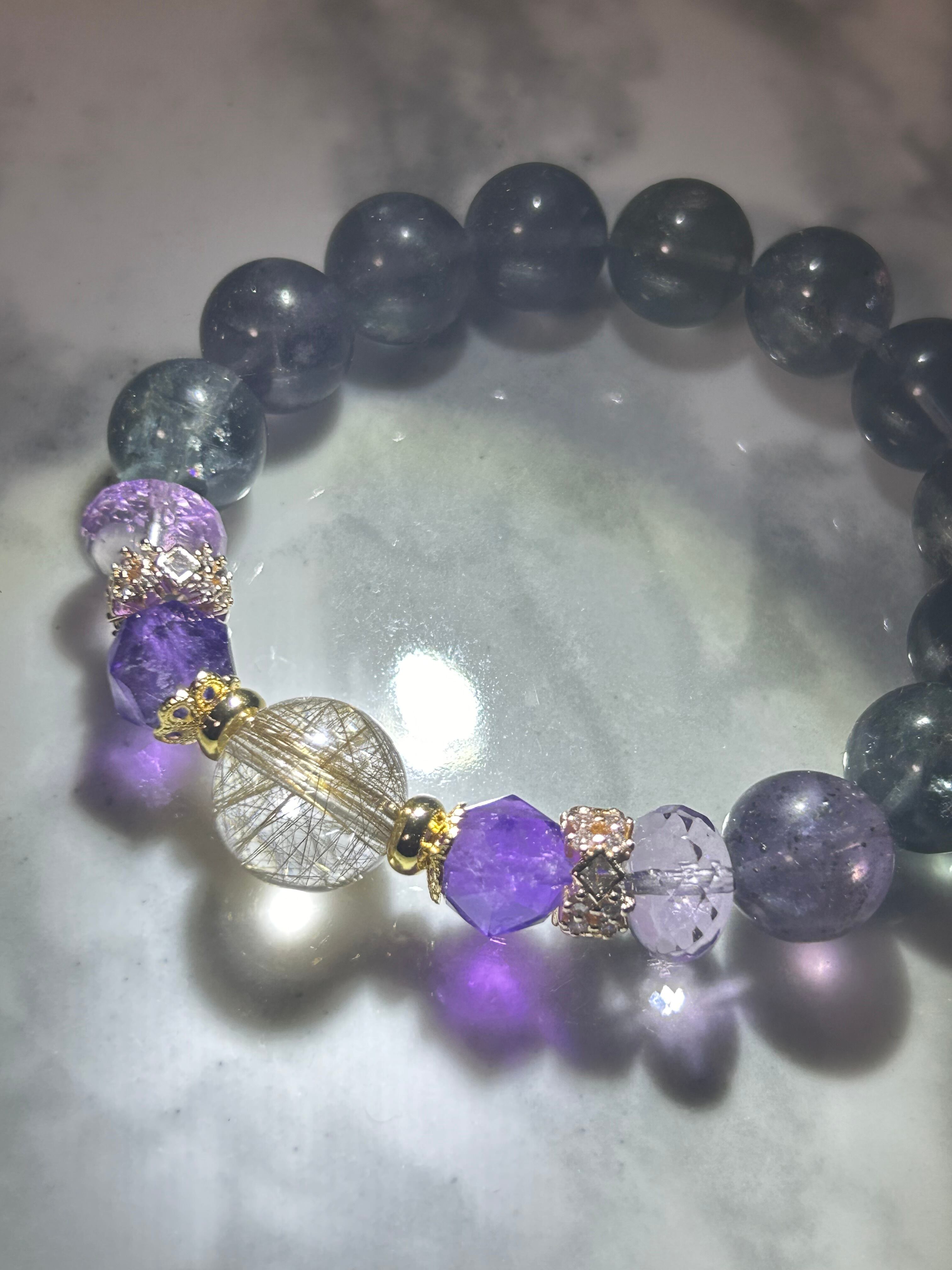 シルバールチル、アメジスト、アメトリン、パイライトインフローライトのブレスレットは、それぞれ異なるエネルギーと効果を持ち、組み合わせることで総合的なサポートが期待できます。